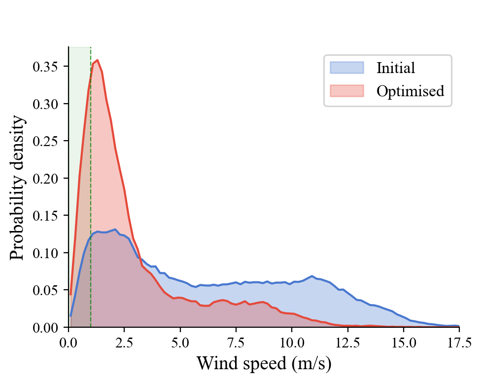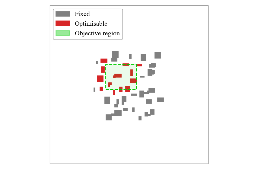 Since WinDiNet is end-to-end differentiable, it can serve as a physics simulator for gradient-based inverse optimization of building layouts. Building positions are iteratively updated to minimize a comfort loss that penalizes dangerous gusts, speeds outside the desired comfort range, and stagnant zones in a downstream objective region.